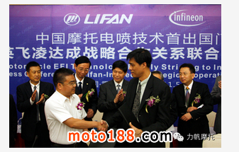 早在1999年,力帆便開始投入巨資自主研制摩托車電噴軟件和電噴系統技術。公司利用自主研發技術,在國內首家研制并成功應用了“力帆摩托車電噴管理系統”,填補了國內在中小排量汽油機進行電控燃油噴射的空白,并推出了目前國內唯一上市銷售,并擁有自主知識產權的電噴摩托車。2009年11月力帆和歐洲第二大芯片廠商德國英飛凌科技公司開始合作,力帆利用英飛凌提供的具有高技術含量的芯片,來優化其摩托車電噴應用平臺。2011年融合了英飛凌開發的電噴系統專用芯片和力帆的電噴技術,具有最小型化、最優化集成功能的摩托車電噴專用芯片的力帆電噴應用平臺成功邁出國門走向國際化市場。