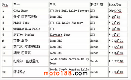 Team HRC的另一位車手胡安·巴雷特共拿下來了4個分賽段冠軍,原是2015達喀爾拉力賽總冠軍頭號競爭者的他,在烏尤尼鹽沼的比賽中首惡劣天氣影響,遭遇滑鐵盧,積分榜上的排名僅17名,艾爾達·羅德里格斯最終收獲兩個分站冠軍,積分榜排名第12位。