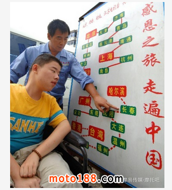 感恩的旅途并不輕松。三輪摩托載著輪椅,每天只能行駛100多公里。鐵皮包的車廂,雨天冷,晴天熱,火辣辣的太陽一曬,車廂內(nèi)變成了“桑拿房”。黃舸在車廂里的輪椅上顛簸,每行駛一兩個(gè)小時(shí),就不得不讓父親背下車來透透風(fēng),活動(dòng)一下身體。父親心疼兒子,為了讓孩子看到更多風(fēng)景,把三輪摩托駕駛座前面、上面的玻璃和擋雨布都拆了,騎車雨天一身濕,晴天一身汗。說起父親,黃舸也幾次哽咽:因?yàn)樽约?ldquo;最后”的執(zhí)拗,虧欠父親很多。父親還反過來鼓勵(lì)我,說知恩圖報(bào)是好事,我們都是男子漢,應(yīng)該執(zhí)著。