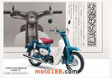 本田公司為紀念Super Cub通過了日本立體商標認證,推出全新配色的“Little Cub特別版”。這款Little Cub特別版定于2015年2月13日起于日本正式限期發(fā)售,至2015年3月29日發(fā)售截止,售價237600日元。