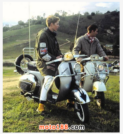 VESPA 與60年代興起的MOD(Modernist)文化分不開關系。60年代的英國,經濟騰飛,工作大把,小時候吃過苦頭的年輕人方知甜滋味。而因為有了獨立的經濟能力,他們把不少精力花在娛樂扮靚上,這較之他們的上一輩自由許多。除了標志性的Fred Perry Polo衫外,Ben Sherman的箭靶T恤、窄身西裝、Rayban墨鏡、Clarks沙漠靴或一雙Dr.Martens之外,一輛輕便的VESPA小綿羊機車也是趕時髦 家伙們的指定裝備。通常的情況就是,這些年輕人周一至五勤快工作,一到周末就拿出衣柜中最漂亮的衣服去徹夜狂歡,而因為有了VESPA,他們也不用擔心趕 不上最后一班公車之類的糗事。