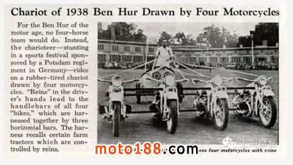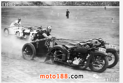 摩托車戰(zhàn)車,很像古羅馬時期的車展。這種比賽在1920年代達(dá)到了頂峰,此后一直持續(xù)到1930年代才逐漸衰落。遺憾的是,當(dāng)時的比賽選手是如何駕馭這樣的戰(zhàn)車的,目前已經(jīng)沒人能夠搞明白了。比如有的戰(zhàn)車手,能夠同時駕馭四輛摩托車組成的戰(zhàn)車。
