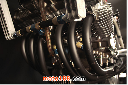 當年賽季的GP250組,本田推出了前所未見的RC166賽車:雖然排氣量只有區區249.42cc,但是居然采用了直列六缸的汽缸結構,這樣每顆汽缸只與拳頭大小相當!但是你可千萬別小覷這些“小拳頭”,因為采取的是強化轉速的設計思路,轉速紅線高達18000rpm!為了滿足超高轉速的需要,這臺RC166安裝了當時很罕見的雙頂置凸輪軸(DOHC),而且由齒輪而非鏈條驅動氣門,同時還安裝了6只化油器,每只氣缸都有獨立化油器伺候,以保證高轉速時“呼吸”能夠跟得上。由于直列六缸采用的是風冷結構,而且轉速超高,為了保證發動機能夠持續高動力輸出,RC166還安裝了小型機油散熱器,以降低發動機的高溫。