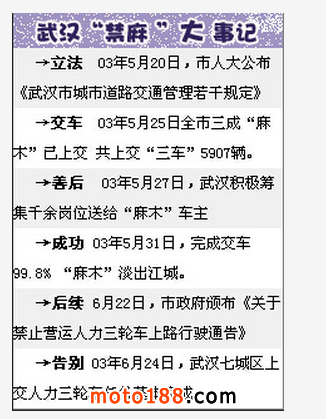 武漢的麻木可謂是“歷史悠久”,以往每天幾萬輛麻木穿梭于大街小巷,構成了武漢街頭一道獨特的風景。據統計,從1997年到2003年,武漢市的非法麻木超過3萬輛,加上合法的麻木,總數超過5萬輛。長期以來,圍繞著這數萬輛麻木,事實上形成了一個相互交錯的利益關系網。擠占道路、危及安全、影響秩序、污染環境、損害市容,成了麻木最為人詬病的幾點。