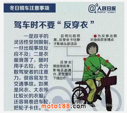 騎摩托車時被撞倒的事常有發生,若這時反穿了件厚衣服御寒,導致其倒地后手腳受阻,結果容易造成頭部著地。氣溫低時,街頭“反穿衣”騎車現象隨處可見。交警提醒,“反穿衣”有溫度沒安全,等于雙手被束縛,緊急情況下可能致命。