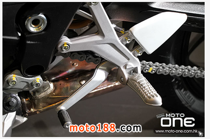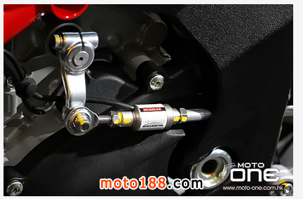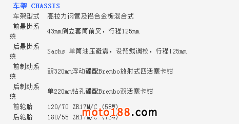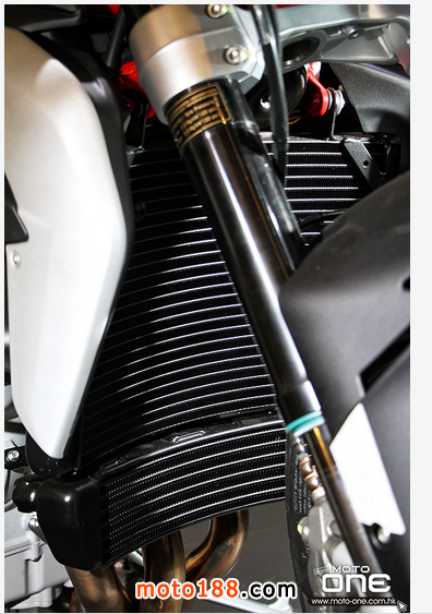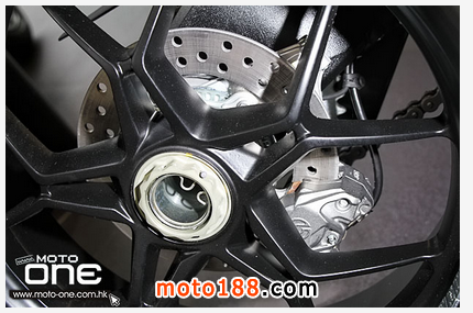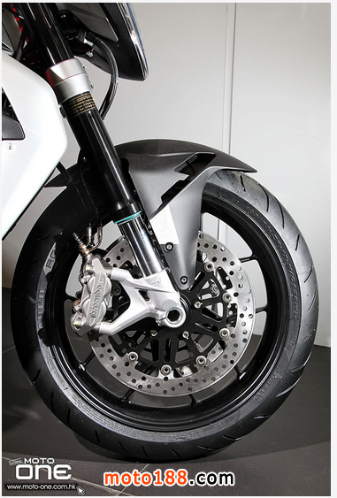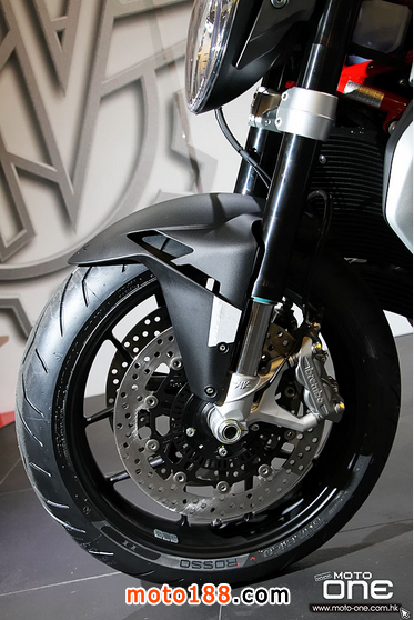 ●前掣動(dòng)是雙320mm浮動(dòng)碟配Brembo放射式四活塞卡鉗,一對(duì)擁有全調(diào)校的MARZOCCHI 43mm倒立前叉。