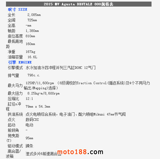 不論是BRUTALE 800還是RIVALE 800,也是使用同廠的直列3汽缸引擎,而新引擎的缸徑雖然跟675的79mm相同,但沖程卻由45.9mm增至54.3mm。從這方面來看,跟講求中、 高轉(zhuǎn)輸出的675引擎相比,擁有較長沖程的新引擎相信可照顧低扭輸出方面的需要,使馬力輸出有更廣闊的Powerband,并配備了ABS防鎖死剎車系統(tǒng) 及快速電子升檔器,更適合日常駕駛需要。