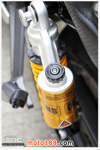 設有預載的43mm套筒前叉,前叉鍍上DLC(Diamond-like Carbon)碳纖色彩令其更具古典,氮氣輔助的雙筒Ohlins尾避震已是原廠配備,省卻了日后的花費,就連那鋁合金搖臂也是烏卒卒的,令人不易察覺原 來的金屬。沿用那「一體式」四活塞對向卡鉗,這設計一直套用在廠方的高性能車子上,信心的保證。鋁合金把手也是原廠配備,相當貼心,就連那表板也是全新設 計,芯片車匙自然少不了﹗
