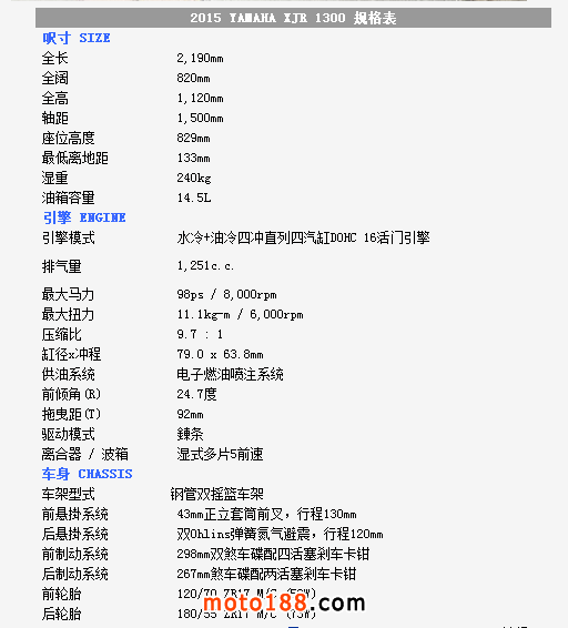 ●1999年的XJR由1200增至1300,并加入了電子燃油噴注,避震的設定也經過改良,前煞車卡鉗也改用R1風格的星星設計,前胎也由過去的130改用更靈活的120。