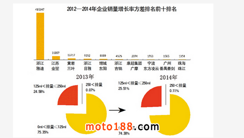 從各排量區間的銷售占比來看,250排量以上的摩托車,2014年銷量占比為0.11,同比2013年上漲0.04%.
