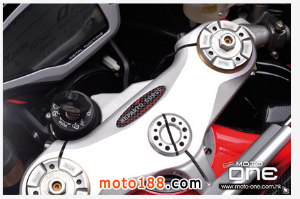 至于MV AGUSTA F4 RC與本志早前試駕的F4 RR版有甚么分別?簡(jiǎn)單來(lái)說(shuō)是重量輕了且馬力大了,例如RR版使用纖維大包圍,而RC版則使用全碳纖包圍,RC版全車還配用鈦合金螺絲,單是螺絲方面已偷 輕了1.1kg,原裝排氣管也是鈦合金製造,波箱外款也改用金色的鎂合金制,並且改用輕量化的鋰鐵起動(dòng)電池,還有RC版配備專用的鍛造輪框,以上是偷輕元 素之一。