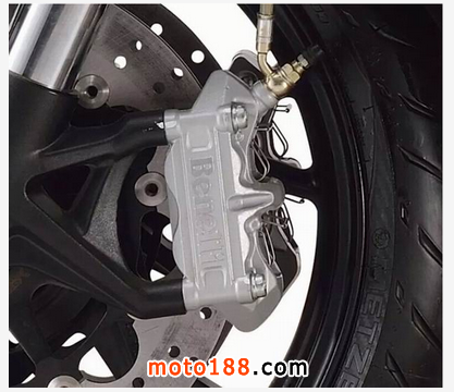 前液壓剎車(chē)手柄,采用國(guó)外高檔摩托車(chē)前制動(dòng)上泵,專(zhuān)門(mén)匹配設(shè)計(jì),更人性化的設(shè)計(jì),前制動(dòng)手柄有四個(gè)檔位調(diào)節(jié)張開(kāi)寬度,適應(yīng)不同大小手型,更安全可靠。前制動(dòng)卡鉗采用和國(guó)外高檔大排量摩托車(chē)一樣的對(duì)置四缸設(shè)計(jì),只型體稍小,專(zhuān)門(mén)匹配設(shè)計(jì),制動(dòng)更平穩(wěn),剎車(chē)片磨損過(guò)中會(huì)自動(dòng)跟進(jìn),減少了手動(dòng)調(diào)節(jié)間隙的需要。