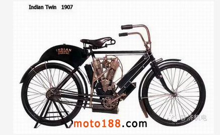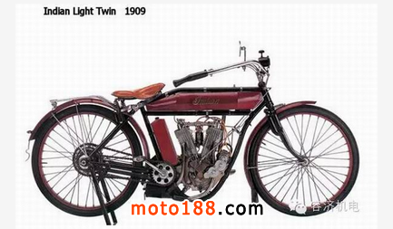1903年一種V形雙缸設計出來,配備了2和3級變速箱,而且還有搖臂式后減震。1904年印第安產量達到596輛摩托車,并且在圣路易斯博覽會的最佳機械的評選中贏得金牌。許多超前的設計理念大多歷經多年才得以實現。比如:完全可調式前懸掛,V型雙缸發動機;電子點火器;吊掛彈簧車架。