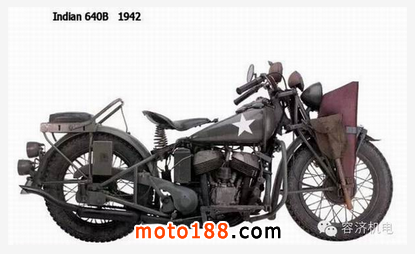 二次世界大戰期間印第安和哈雷-戴維森都為軍方提供大量的摩托車。法國gov-ern-ment訂購的5,000輛“酋長”機車為印第安公司提供了有力的支持,以保證它能繼續開發更好的技術和款式。如:1940年的框架式擋泥板和其他設計更新包括活塞式后懸掛。印第安再一次站到了美國摩托車工業的前沿陣地,1943年還取得了另一個獎項:美國軍隊-海軍生產獎。同樣的軍隊供應合同,哈雷通過談判取得了更好的合同,而印第安則在戰爭后期遺留下資金回收困難的問題。