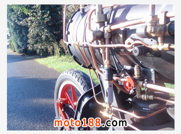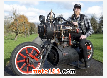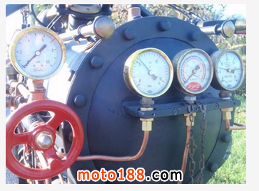荷蘭Revatu Customs車輛改造工作室推出了一輛摩托與蒸汽火車頭混合版蒸汽摩托車,其炫酷夸張的造型讓蒸汽迷愛不釋手,各種壓力閥門、機(jī)軸驅(qū)動的后輪,騎上去異常拉風(fēng)!其速度必然同蒸汽火車一樣不忍直視咯,每小時僅能跑5英里。