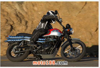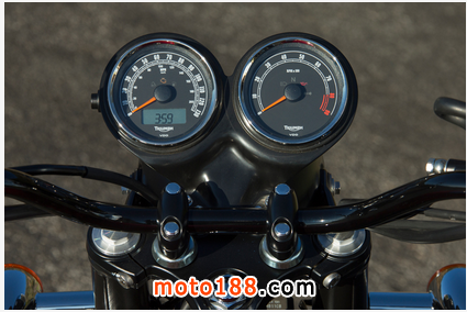 從Ducati與Triumph對比研究。凱旋感覺舒適寬敞,包容和寬松相比,特別是與乘客; 長雙乘坐起來相當過癮這種摩托車。然而,對于運動騎它的馬力,靈活性和前制動感覺就不能和現在的車種相比較。但正如我們花更多的時間在我們長大習慣的改變坐姿; 雖然落后一點的剪切和推力騎相比Ducati,凱旋高高聳立在它自己的優點。其59.0英寸的軸距,28度轉向耙和517磅的濕重全部加起來更大,感覺一個更重要的沉著和隨和的性質。盡管其較低的52.8馬力的峰值,仍然有足夠的扭矩在手的樂趣并在865cc的270度的曲柄,風冷,八閥門廠與5速變速箱使發動機人物和引人入勝的感覺。