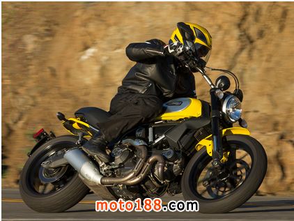 跨越車軸之間的短56.9英寸,其69.8馬力和411磅的整備質量使這個摩托車變的活潑和運動了。它的低座椅坐在只有31.1英寸高,專門通過展廳的地板提供一個放心的配合,以吸引新的車手和婦女加入Ducati的Scrambler。標準座位是專門切割縮小了前面,方便地乘坐,但大部分車手以30英寸以上的內接縫會發現座椅/ PEG接口令人不安的局促。另外三個杜卡迪的Scrambler分別是,經典,城市耐力賽和烈火戰車,將提供車手顯著變化適應,以及造型,特別是與豐富的配件,將填補了這個品牌。