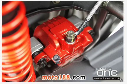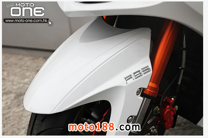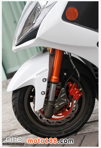 ●原裝車已配備橘色的倒立前叉、橘色煞車卡鉗及煞車碟,讓車輛看起來有改裝味道。