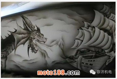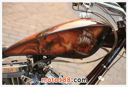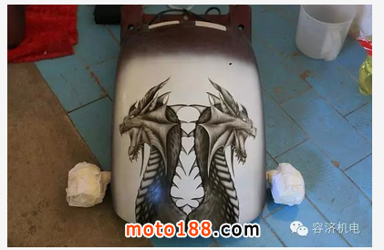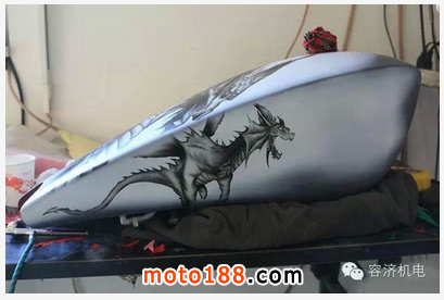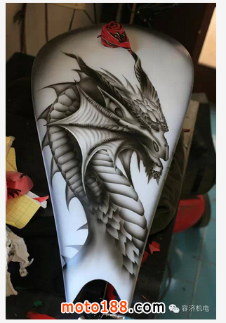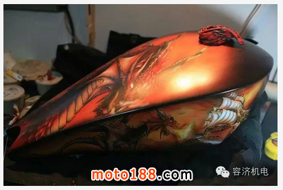 一個(gè)小小的油箱上,龍是活著的,并且如此淋漓盡致,當(dāng)龍跟摩托車結(jié)合在一起的時(shí)候,就是一件活著的藝術(shù)品。彩繪的過程是痛苦的,新入手的愛車為了披上美麗的外衣,被拆的七零八落。油箱上面的彩繪,打掉原漆的時(shí)候,手顫抖了。。。。。。
