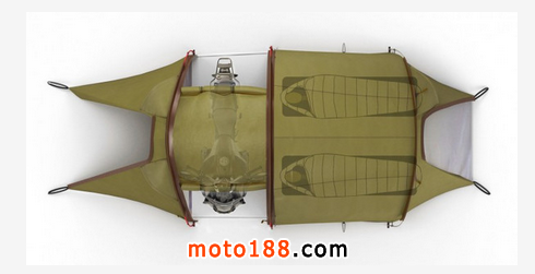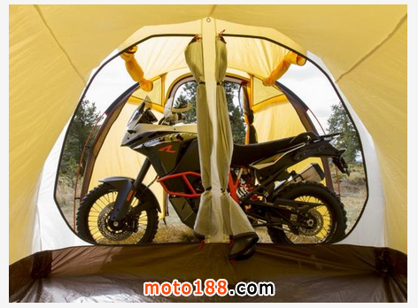 英國出生、軍人、冒險家這幾個關鍵字成就了一個 CEO——Kevin?Muggleton,他的人生中超過 4 分之一的時間都在「這么大的世界上走走」。這 20 年中,他幾乎坐過世界上所有的交通工具,但是毫無疑問,他還是最愛他的摩托車,旅行是他的血,而「家」則是個帳篷。所以他和他的隊伍發明了這個——Atacama 探險摩托車帳篷,一個可以把摩托車放進室內的雙人帳篷。這個 23 英寸大的帳篷是一個三居室,當然大屋必須是給摩托車住的,人可以睡在兩個小屋,不論你開的是哈雷、街跑或者越野,254×96 厘米大的車庫都可以放得開。