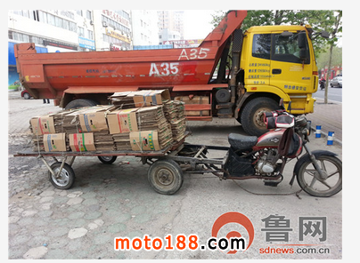 無獨有偶,當民警正在處理該名三輪車駕駛員時,路邊看熱鬧的市民突然招呼民警:“警察同志,看看這輛摩托車吧,也夠奇特的。”民警走過去一看,在路邊建行停車場門口停著一輛摩托車,民警數(shù)了數(shù)一共五個輪子,民警圍著這輛“五輪”摩托車轉(zhuǎn)了一圈上下左右觀察發(fā)現(xiàn),該車是一輛三輪摩托車改裝的,駕駛員把原來摩托車的車廂拆下,然后又加了一個長約3米,寬約2米的平板,在平板的下方又焊了兩個車輪用來方便拖拽,在平板上,還垛滿了紙箱。民警注意到,該車車廂和車身的連接處只有一根細細的固定軸連接,該車經(jīng)過改裝后,拉的貨物是比以前多了不少,然而,連接的固定軸一旦斷裂,駕車人和其他行人的安全就會受到威脅。就算是固定軸沒有斷裂,這樣的車上路,也是極大的安全隱患。