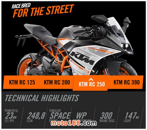 如果你覺得KTM RC200不夠力,RC390又太猛的話,新推出的RC250便可能更加適合你。RC250排氣量由390的單缸375cc下降至249cc,主要分別是缸徑由89mm縮小至72mm。排氣量下降,出力自然縮水。RC250的峰值馬力由44hp下調至31hp,但離合器和引擎潤滑設計都有改良。