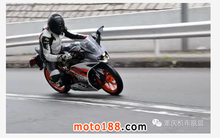 試騎時Alex曾在安全情況下,長時間放開雙 手,只以雙膝夾油缸,也可輕易操控車身作正常轉向。所以當加上推胎和外掛動作后,RC390處理彎道的能力,實在讓人大為贊賞。