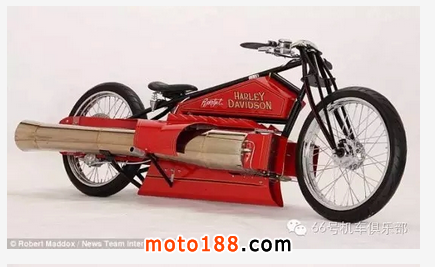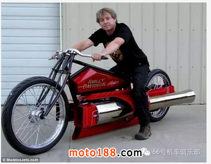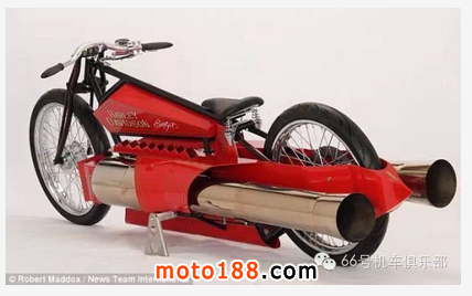 美國業(yè)余機(jī)械師羅伯特-馬多克斯自制了一輛噴氣推進(jìn)摩托車,時速可超過200英里(約合每小時321公里)。這輛車名為“SportJet”。他把一輛1926年出產(chǎn)的哈雷平軌道賽車裝上了兩臺噴氣發(fā)動機(jī),時速從零到60英里(約合每小時96公里)只需要短短5秒。