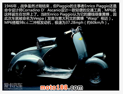 這輛車當然不是你所想象的那么簡單!這得從他的車名開始說起,“946”到底代表了什么含義?這個名稱代表的是比亞喬在“1946年”推出第一輛踏板車作品“MP6”,946之名由此而來。看到這里,相信您大概也知道946的外形到底是向哪輛經典踏板致敬了吧?沒錯,就是在摩托車歷史中占有相當地位的Vespa MP6。