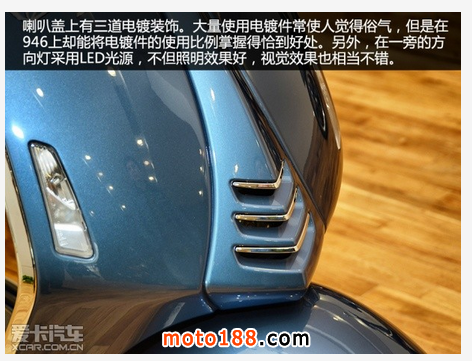 Vespa 946的車體仍然使用鋼制車身,但是前擋泥板與車體后方兩側則使用了鋁合金材質。更令人心醉的是,優美的車身設計在燈光的照射之下所產生的折射,明顯比起其他Vespa更有質感。