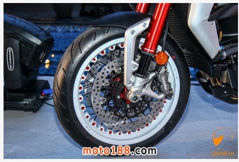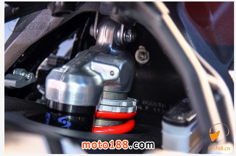前叉為43mm Marzocchi 倒立式前叉,并採用紅色陽極處理,吸睛效果一流
