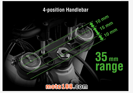 新車采用一個新的、更輕的底盤,且更大范圍內以鈦、鋁等材料進行制作,使新的整備重量降低到了 108.7 公斤(比 2015 款輕了 3.4 公斤)。2016' KX450F 另一個特點,是在對車手的駕駛姿勢給予了更多了選擇:車把、前叉連板針對不同的狀況作出調整;而新的腳踏設計則更加符合人體工程學。此外,采用了新的、具備更高性能的 Showa SFF-Air TAC 空氣懸掛(前叉),也是新的 KX450F 的亮點之一。