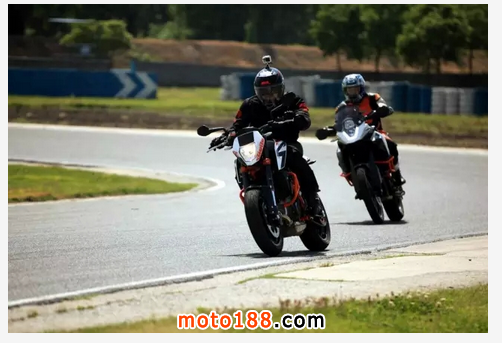 KTM的DUKE690R賽道測試后倪巍點評:在KTM全系列的車型中,是最適合我個人駕駛風格的一輛。首先車子身輕如燕,令車手可以毫無壓力的駕馭它。無論城市道路如何多變,也能輕松應對。前后懸掛的行程較長,這點使它在郊外也可以得心應手。在KTM家族中能算得上是個“多面手”車型。對于類似天馬賽車場的中小型賽道而言,此車能最大限度的包容車手在操作上的輕微失誤。因為具有靈便的操控和充足的制動力,它能呵護車手釋放出自己的最大信心感。雖然這車的動力和公升級是無法相提并論的,但功率重量比十分優秀。特別是在出彎道加油門時,油門響應十分靈敏毫不懈怠。如果你是特技愛好者,那這車是再適合不過了。無論車身的輕巧還是低扭的爆發力都能出色完成技巧動作。對于新手而言,暴躁的低扭矩和極為靈敏的制動真的是需要一段時間去適應,否則失控的情況難免出現。