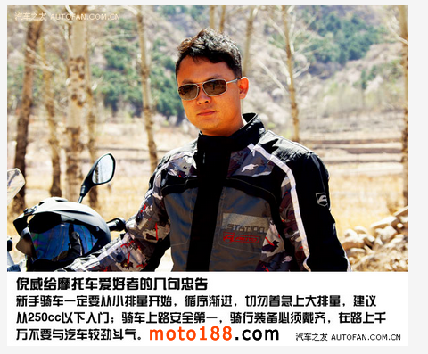 作為我們編輯部里唯一開車不被朱熙嫌慢的年輕人,王宇充分地詮釋了后生可畏這個詞匯的含義。他剛剛考下摩托車駕照,就躍躍欲試并滿懷激情地投身到我們的摩托車大聚會之中,竟看不出絲毫的膽怯和青澀。假以時日,當他練好本領,并能對摩托車的安全規則始終報以敬畏之心且嚴格遵守,我相信他必能成為一名技藝高超的摩托騎士。