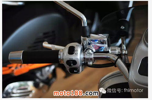 既然大燈下移,車頭部分自然清爽了許多。鍍鉻行李架,無燈設計車把加上擋風板,美觀、實用且對味!而儀表和車把更加有特點,有點類似于LXV車型,方向柱蓋采用機械圓形儀表,油量顯示和時速表完全分開,下方還有單獨時間顯示和功能提示燈,讓人一目了然。車把采用裸露設計,燈光控制鍵居左,啟動功能鍵居右。