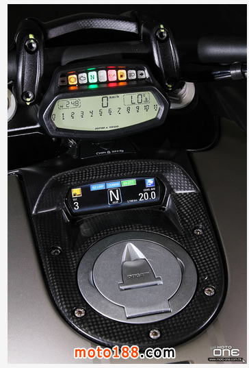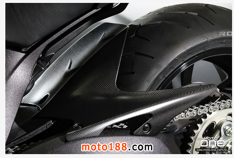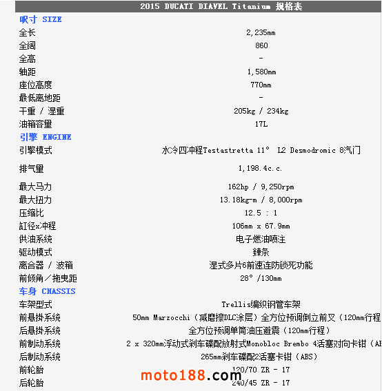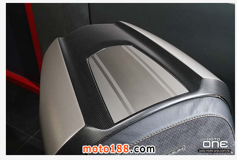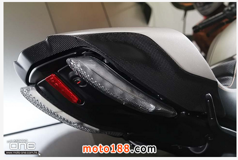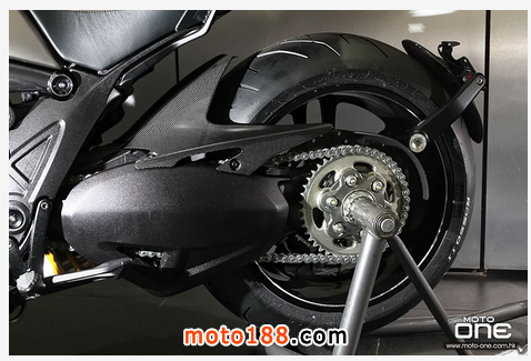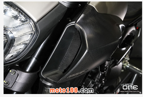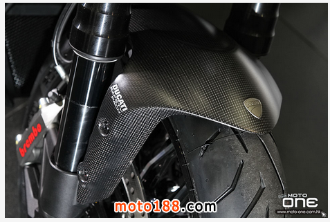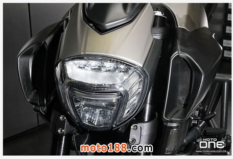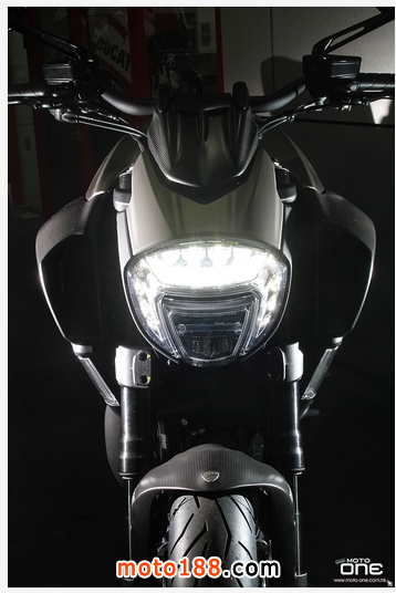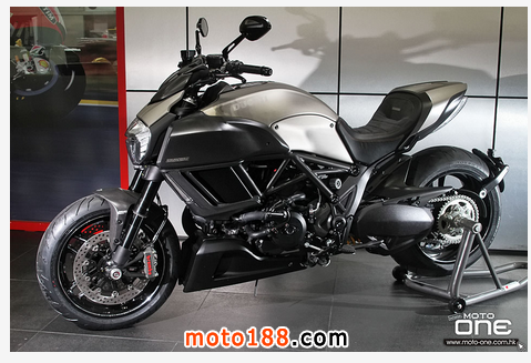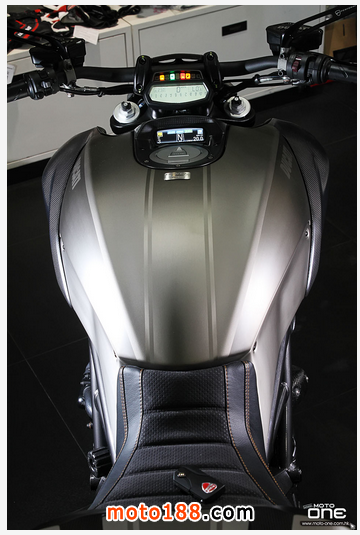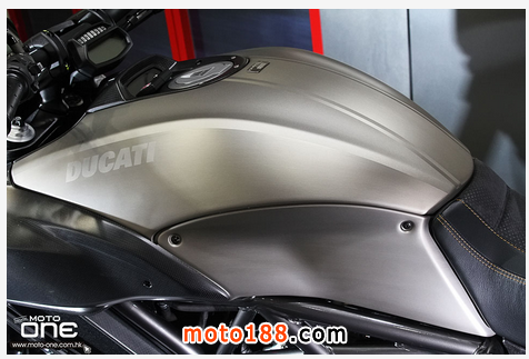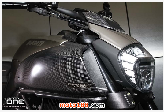 至於DIAVEL Titanium鈦合金版有甚么特別?正如她的型號一樣,油缸外殼及頭燈罩均是採用鈦合金製造,并於車身多處採用輕量的碳纖維部品,DIAVEL Titanium凈重為205kg,與標準版210kg偷輕了5kg,顯示出鈦合金與碳纖維的優質之處。而左右側置式散熱水箱保護蓋及入風口的體積也較其 她版本闊大,加強了車頭的肌肉感。縫制精美的座墊配以TITANIUM(鈦合金)的徽章,碳纖制尾乘客的座蓋也是重新設計,其較闊的面積與車頭的入風口互 相呼應。L2引擎的黑色排氣管採用了陶瓷涂裝(Ceramic coating),尾截的消聲器配以掃漆紋的不銹鋼。