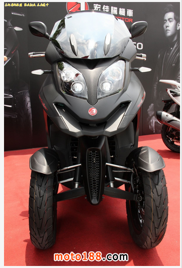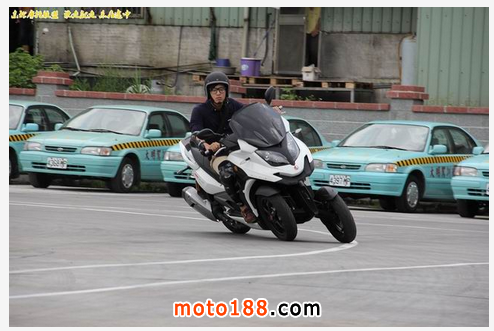 在上車前原本擔心車這麼寬小編本人又算肥短型的,怕一下子跨不過去,但只見工作人員把液壓鎖定拉柄往下拉後叫我直接把左腳踩在腳踏上再跨過去,輕輕松松就上車了,這液壓鎖定根本是小編這種人的福音阿!剛起步發現前輪部分還是有點笨重感,果然多一顆輪子還是有差,但是一壓彎後這種笨重感瞬間轉為穩定的安心感,跟以往的二輪有完全不一樣的感受,搭配上逆操舵的方式傾角一直加大,這種安心感絲毫沒有消失,而出彎時也不需做多余的動作,只需把推出去的手放松車輛自然就回正,直線試著全油門下去,即使載著將近300kg(車凈重212.5kg,至於小編…請自行計算)的重量依然感受的到明顯的加速感,緊接著又一個右彎,記得剛剛的安心感二話不說提高進彎速度,按下煞車!在CBS前後連動煞車系統的作動下讓小編這種沒有受過專業騎乘訓練的人也能以完美的前7後3的煞車力道將車減速穩定進彎,三個車輪穩穩抓住地面,看著離地板越來越近,但是穩定的車身讓這時的小編心中只有四個字「行云流水」,實在印像深刻,到尾聲時刻意維持40km的速度用三寶式煞車法猛然急煞,在沒有ABS系統的輔助下明顯感受到後輪鎖死所傳來悅耳的叫聲,但是在車頭有多一個輪子幫助下依然穩穩煞停,相較以往二輪當下的恐懼感可能已經讓小編忘了自己被噴到哪里去了吧!