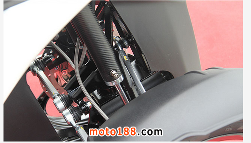 3D-350的前輪懸吊形式采用雙A臂設計,靠近車身的後方則是散熱道與冷排。