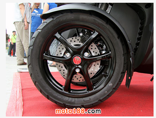 仿賽六爪式輕量化鋁圈,前輪規格為110/80 R14,後輪規格則是140/70 R15;現場提供試乘的車輛,原廠OE胎皆搭配華豐品牌。