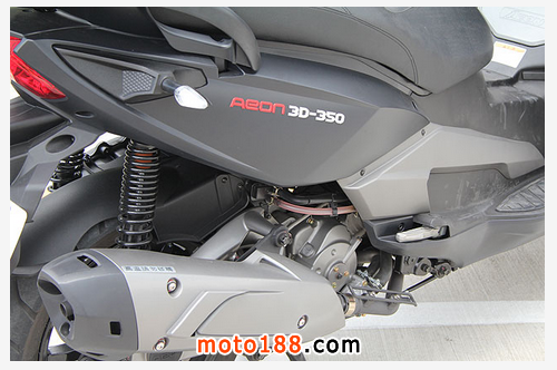 車身側面僅有AEON 3D-350字樣,後避震采雙槍式,後座腳踏板則是飛旋踏板,用腳按壓一下即可收回或伸出。