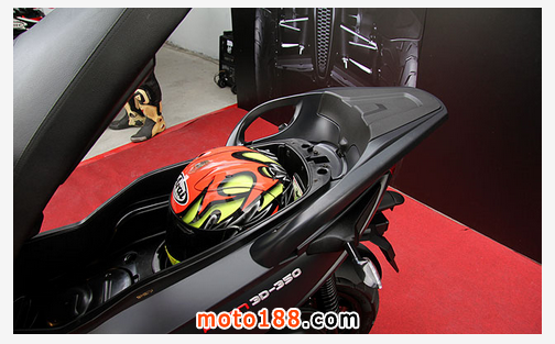 此外,針對大型速克達周末出游的需求,3D-350也內建有USB充電孔、前置物空間、增厚坐墊、可容納一頂全罩與一頂3/4罩安全帽的大型車箱,可提供騎士的手機充電、安全帽放置之用;而3D-350儀表板采用數位化設計,除了一般的引擎轉速、車速、加油、保養、引擎燈號外,還增加有「P」停車燈號,以及環境氣溫及水溫數位計,增添不少實用性。