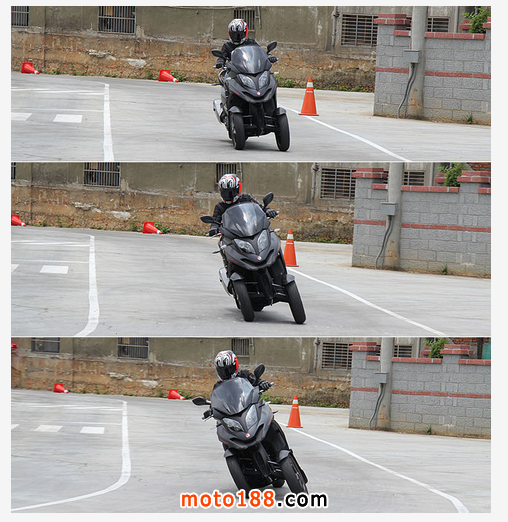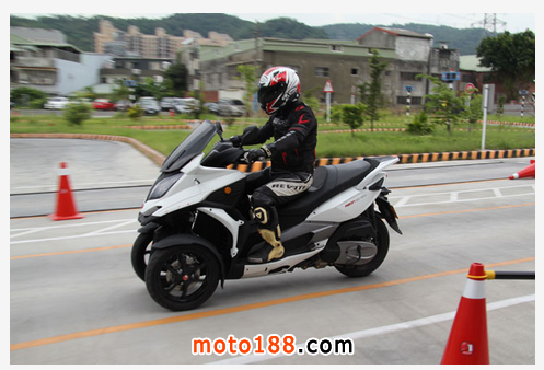 來到第一個右彎,筆者心中反覆記誦著逆操舵技巧,右手虎口輕輕推送把手,身體重心往右偏,馬上可以感受到車身微微往右傾斜,出彎時則恢復身體重心并且手放松,3D-350就會回復到穩定的狀態。以直線來說,3D-350的表現可說是相當穩重,因為三輪形式的關系,即使以慢速前進、或幾乎快停滯的情境下,車子還是非常穩定。