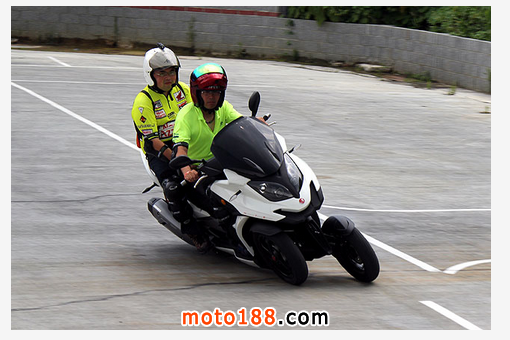 為了讓媒體更加了解3D-350的安全騎乘方式,現場則是由宏佳騰原廠教練示范。乘坐位置適中的情況下,雙腳擺放的部位不建議太後面,同時前臂關節自然呈約90度,騎乘姿勢與一般大型速克達差不多,不過由於逆操舵的駕駛技巧,因此原廠建議騎士的雙手虎口可以與前臂平行、含住龍頭把手的位置,這樣比較便於逆操舵所需的手掌往前推力。