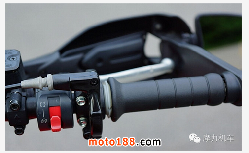 右把手部分,油門座采用大型重型較少見的單油門線,而把手開關部分,則有引擎熄火/啟動與電發按鈕,引擎電發按鈕在熄火開關撥到關引擎的情況時,會一起被遮蔽下來,以避免誤觸造成空轉的情況發生。