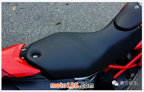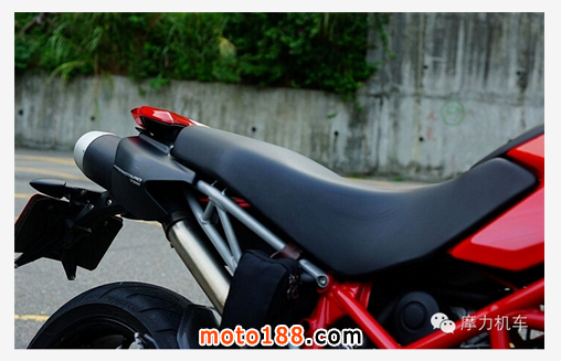 滑胎車必備的一體式窄長坐墊,不過 DUCATI 為 Hypermotard 796 稍微增加坐墊寬度與厚度后,乘坐不像標準越野車或者滑胎車偏硬,載人也不會過于難受。