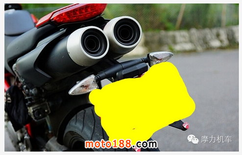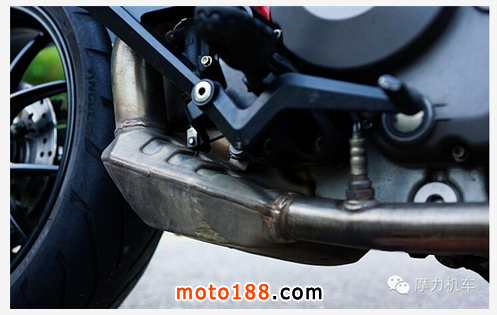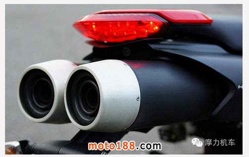 排氣管部分,管體溫度不算太高,但在炎熱的夏季還是需要稍微注意,而雙管的角度可從圖中發現,當氣體離開排氣管后的路線會沖突,有一部分說法是為了減輕后方車輛的不適感,避免未減壓的氣體直接沖擊后方騎士,燃燒過的氣體在離開排氣管后相撞,會互相抵銷氣體的沖擊力,讓廢氣壓力不會這么明顯。