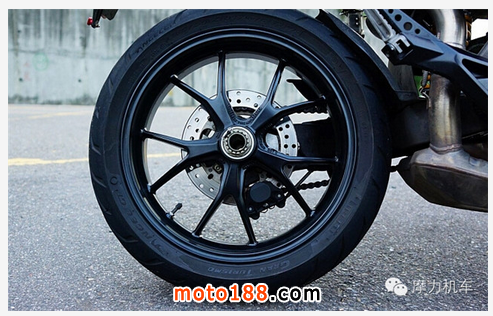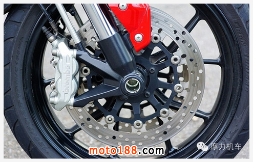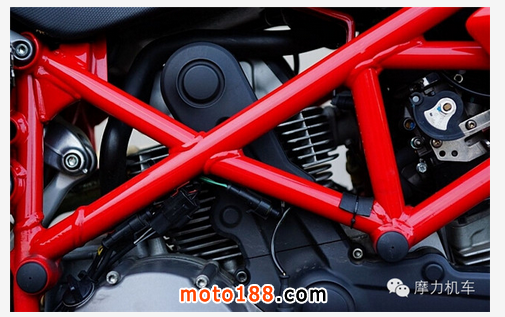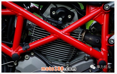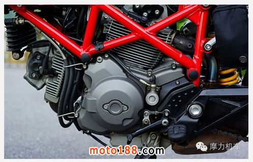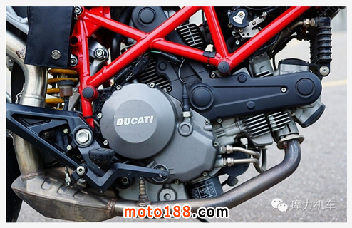 接著看到被稱為 L 型雙缸的 V型90度雙缸引擎,這顆由 DUCATI 制作的雙缸引擎,在 8000rpm 時能爆發出 81hp 的馬力數值,而在 6250rpm 時則能提供 7.7kg-M 的扭力輸出,對于這樣輕量化的車體而言,帶來的樂趣已經非常多。