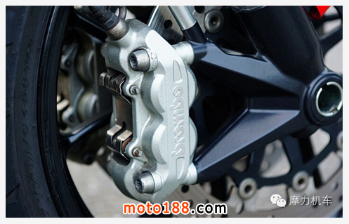 而卡鉗則位于碟盤底下,采用 Brembo 對向二活塞卡鉗,型號為 P34c,而因為這臺車沒有 ABS 配備,因此在煞車時要注意后輪的緊度,尤其偏大的碟盤加上如此有力的剎車系統,更得要注意低路面磨擦力的剎車拿捏。