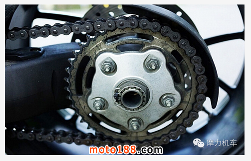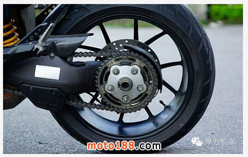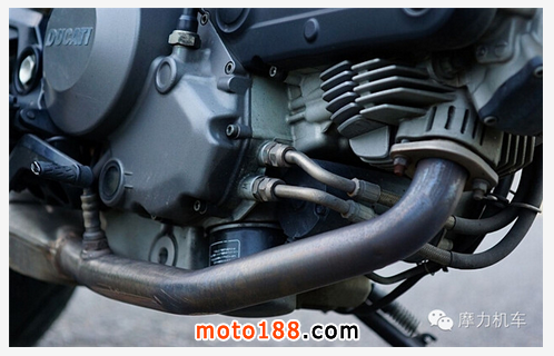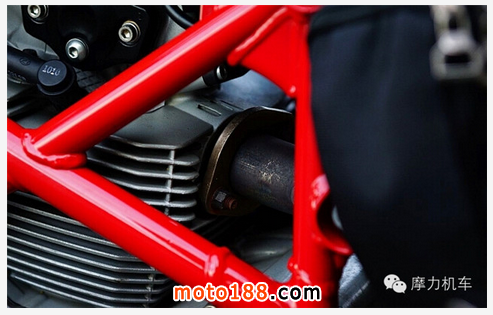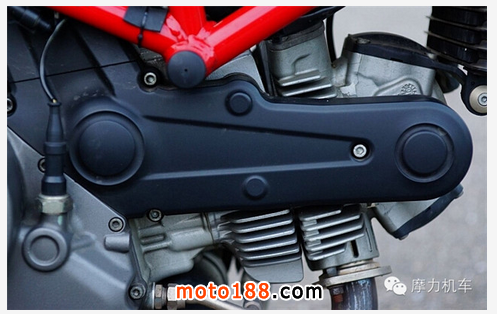 DUCATI 獨家的 Desmodromic 氣門技術,氣門的開啟或關閉都僅靠凸輪軸推動,并在 Hypermotard 796 以及其他大多數 DUCATI 車款舍棄內鏈,改以正時皮帶拉動氣門凸輪軸,另外在 Hypermotard 796 上僅有單凸輪軸設計,因此缸頭體積,以及引擎重量都可獲得輕量的效果,圖中的黑色蓋子,就是驅動 Desmodromic 凸輪的外置式皮帶護蓋,內部采用與汽車相同的正時皮帶設計,相信設計師絕對有他的理由。