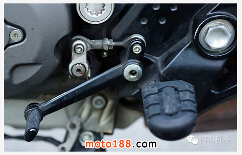 位于左腳踏的打檔桿以及撥叉連桿部份,連桿的長度應該是市售車中數一數二短的,并且連桿還是維持可調整的設計。